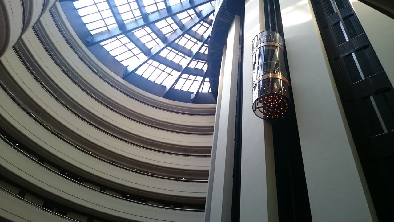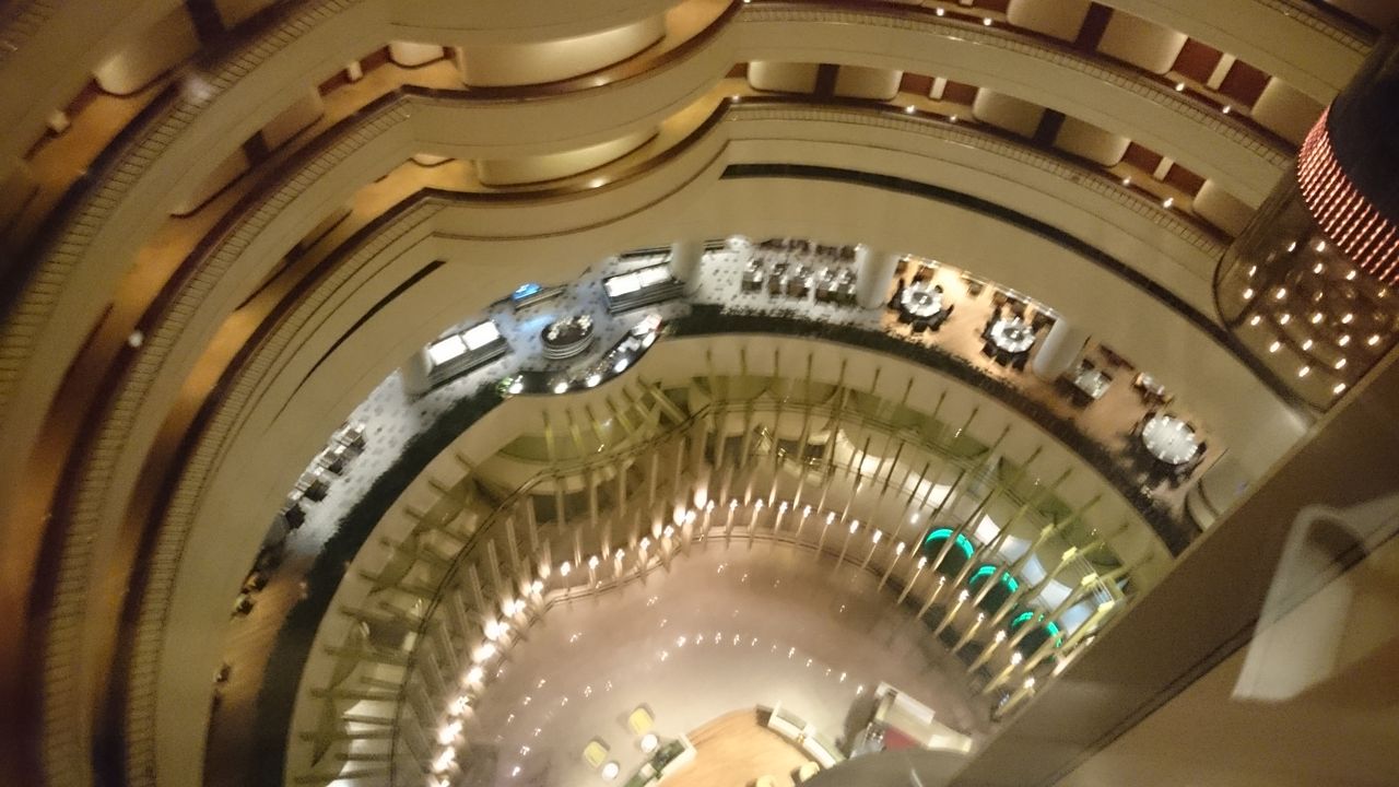円筒形のホテルで真ん中は吹き抜けで、エレベータで見下ろして19階の部屋に。また1階から見上げると。