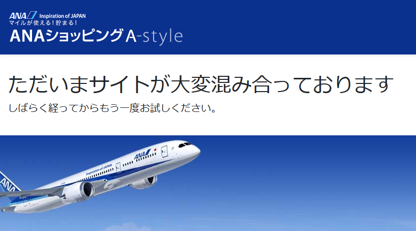 テレワーク中で事前にログインなどの準備が出来なく10時5分に「ANA STORE/ANA ショッピング A-style」を覗いたのですが、アクセスができな状態でした。