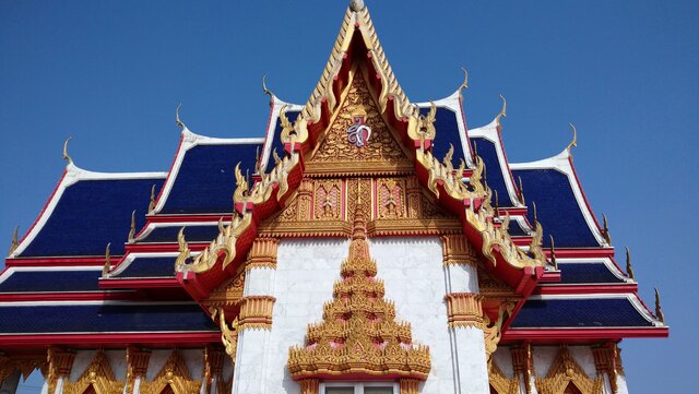 金色に縁どられた青い屋根の美しい本堂。本堂を見ているだけもタイに居るような雰囲気!